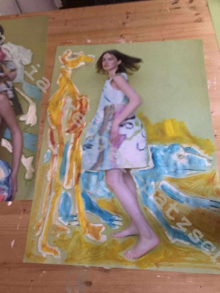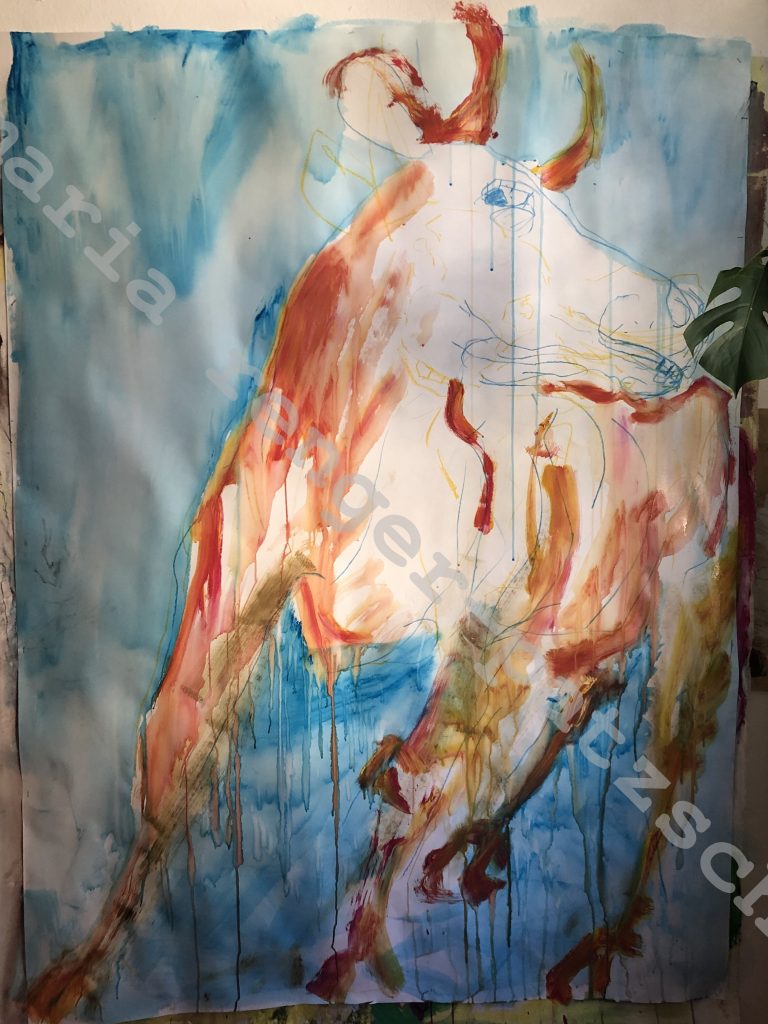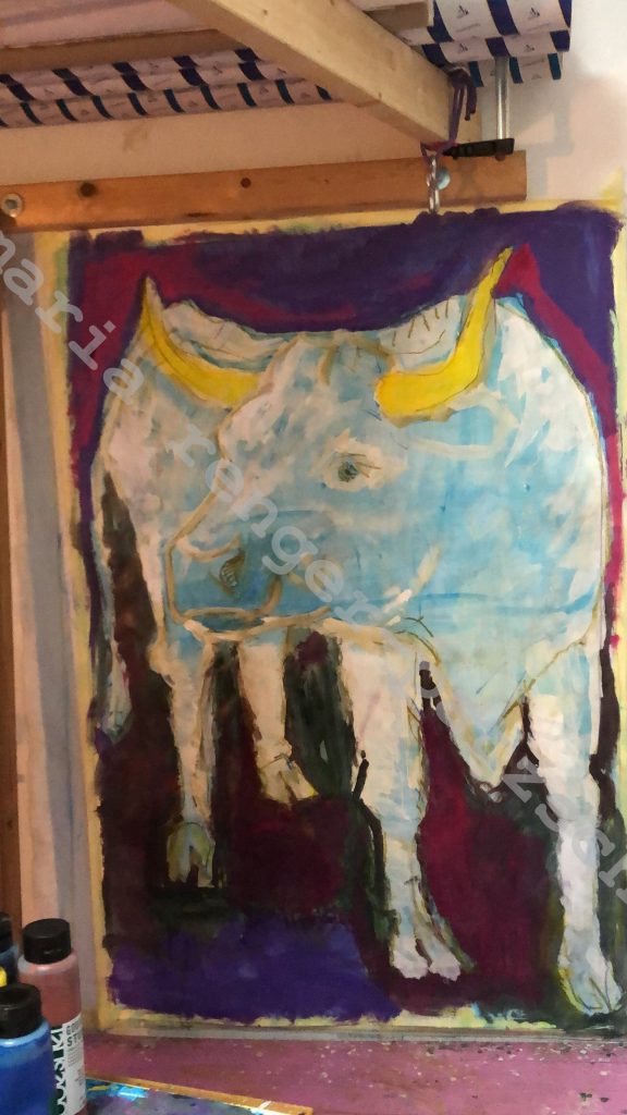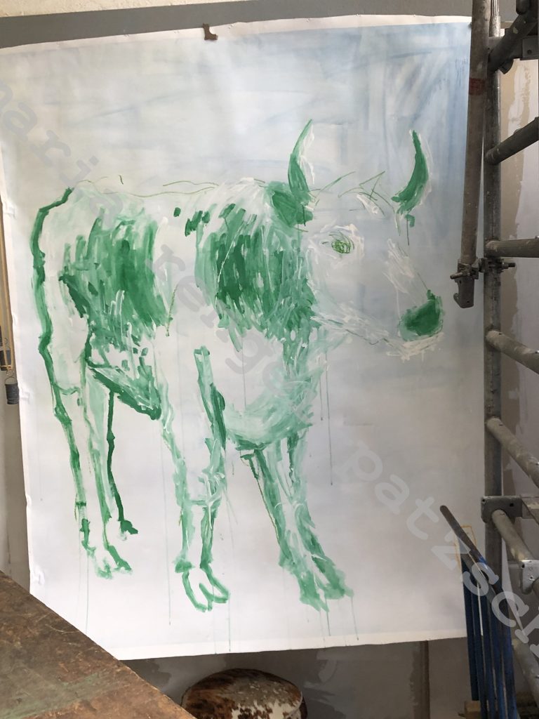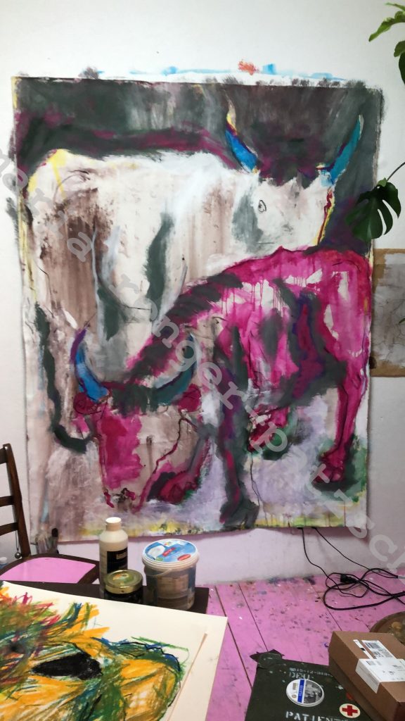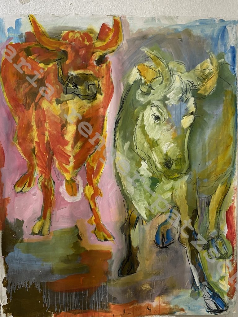 Integration was high on the to-do list. The polar bear and the camel, eternally in love, romp playfully across the canvas. Around the same time, she read a book - A Manifesto for Animals by Corinne Peluchon - which gave rise to the cow paintings. Odette and Lisanne were born from those pages, and to this day they still frolic across the meadows with joy.