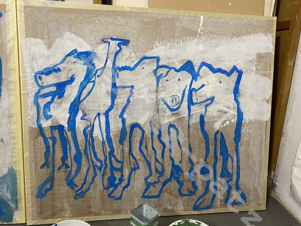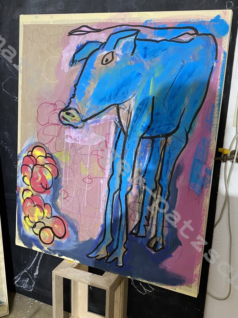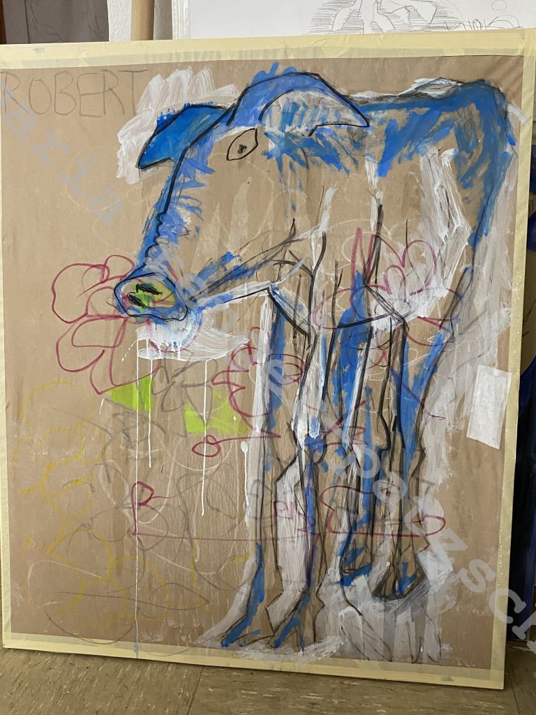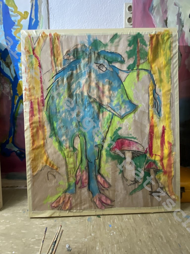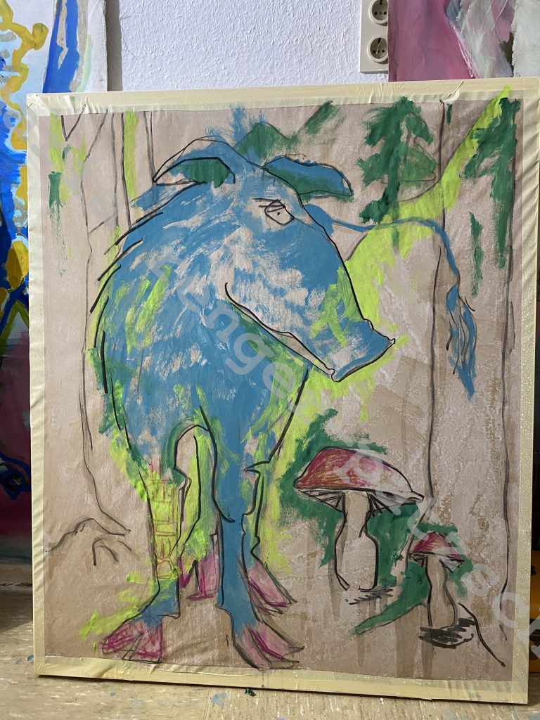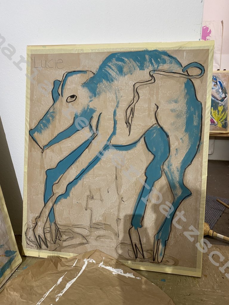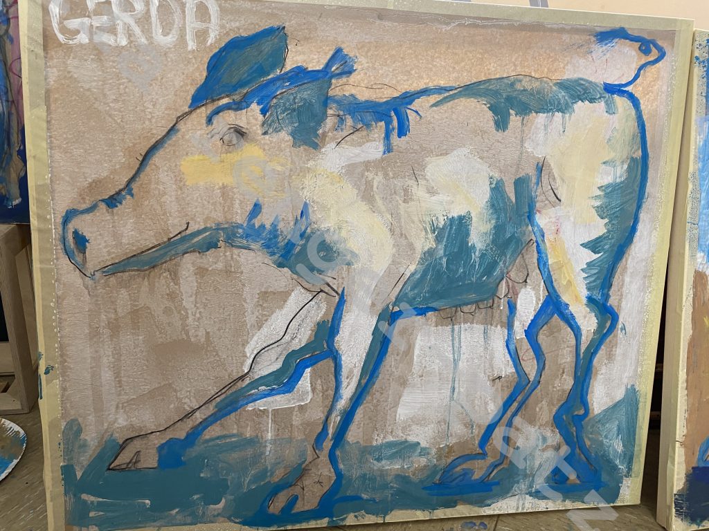 Then came the glued version on wrapping paper, created to bring the Blue Pigs onto some house walls - for those homeowners who wished for that. And the donkey returned to the canvas, checking whether everything was unfolding as it should. A fellow artist joined in, and together we created paintings. It was a wonderful experience.