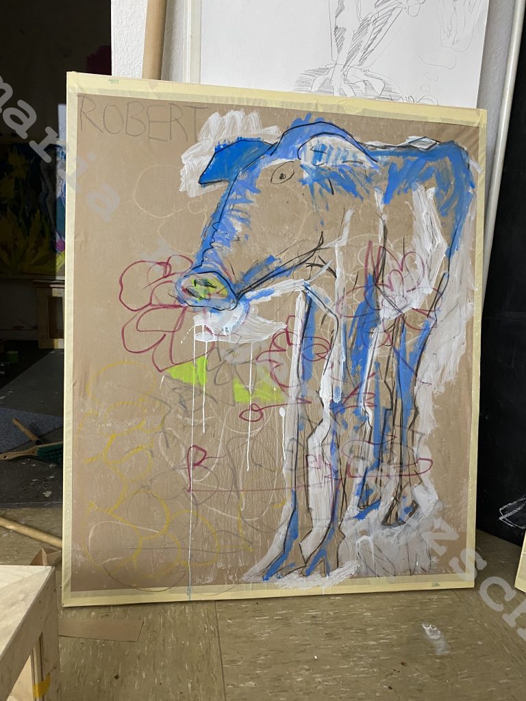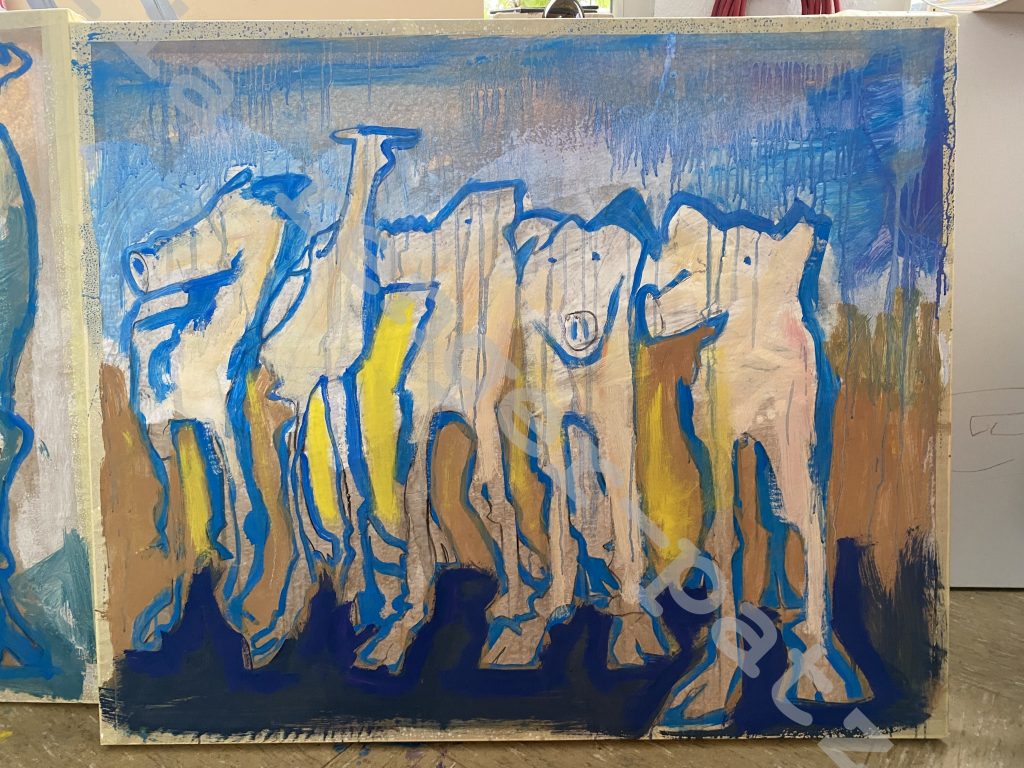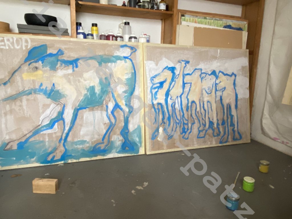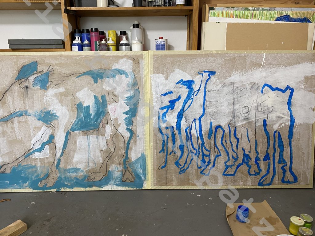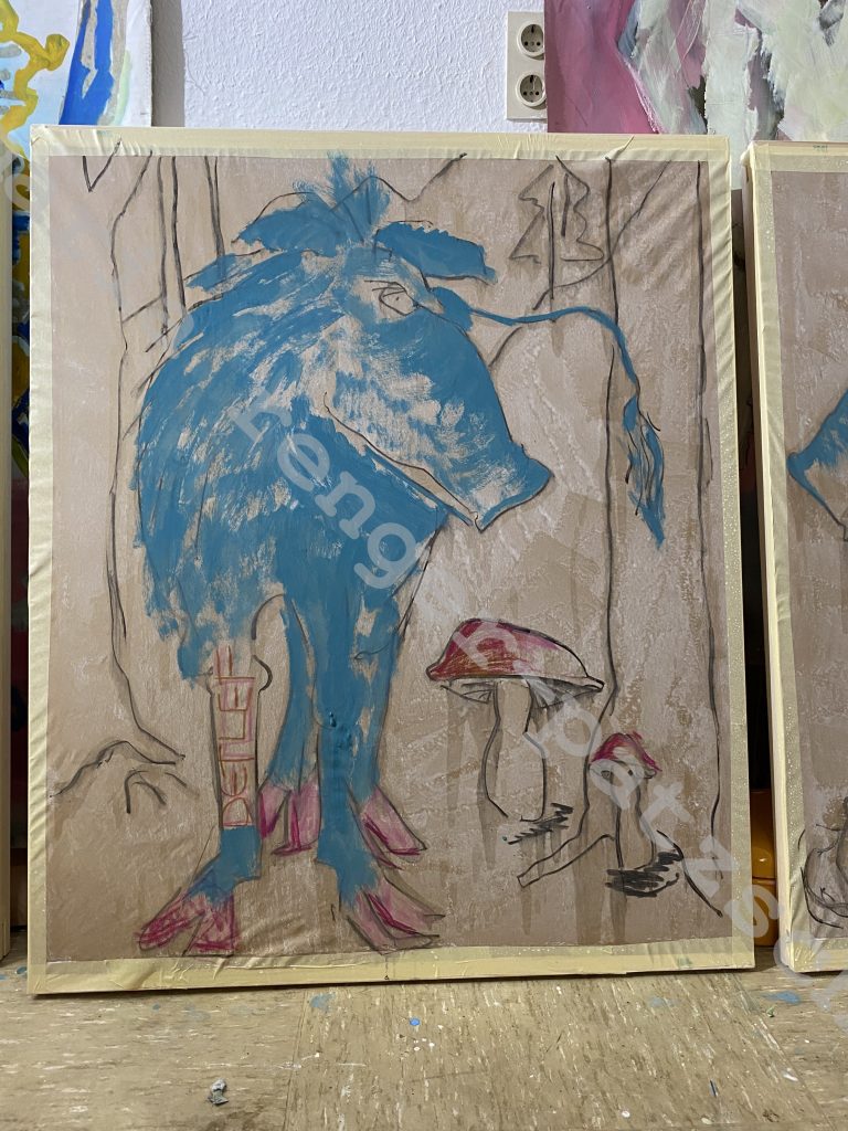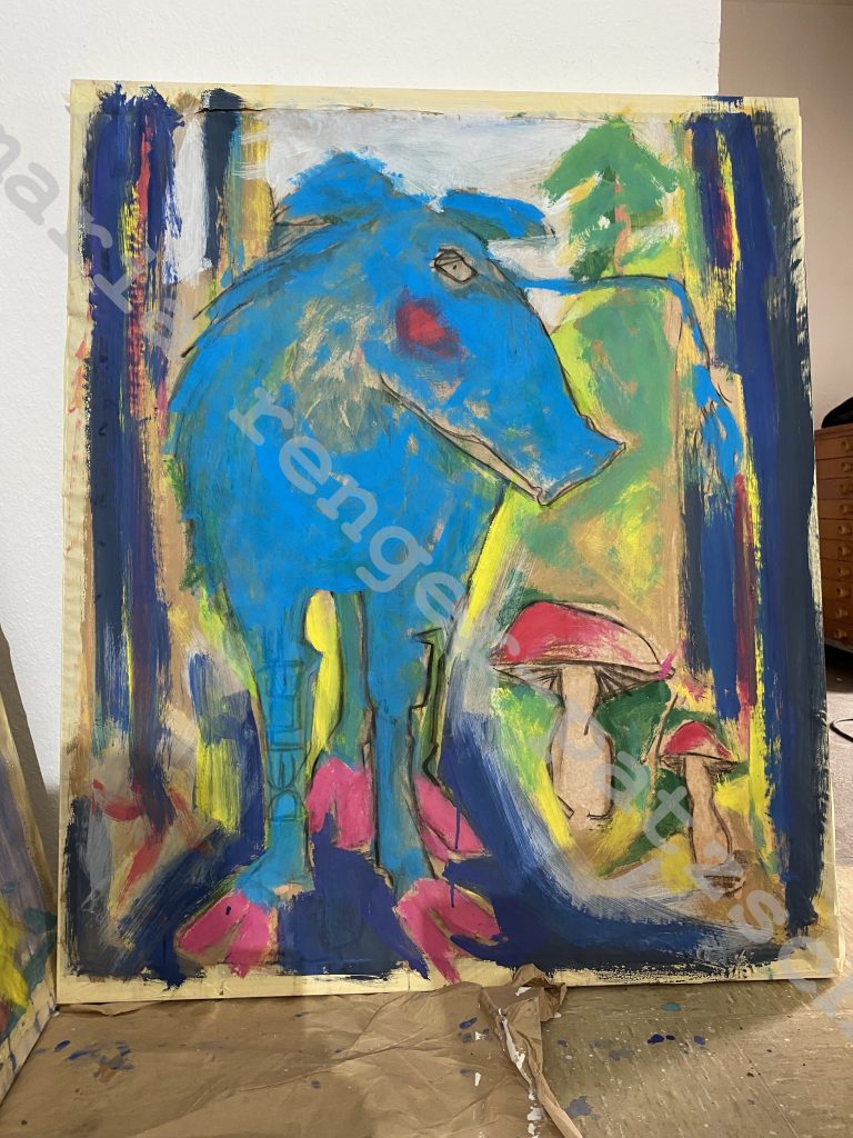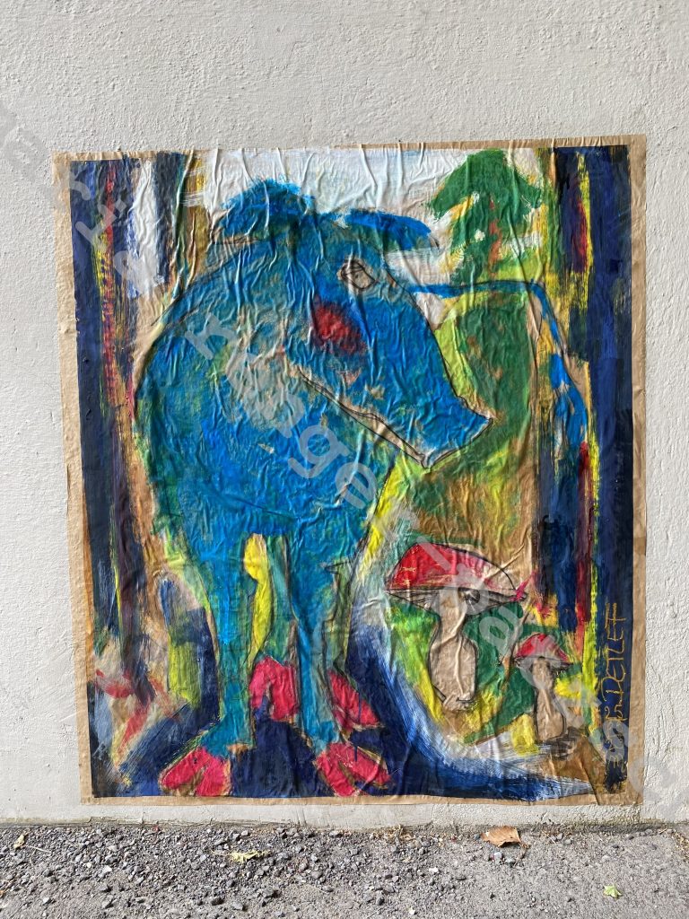 Then came the glued version on wrapping paper, created to bring the Blue Pigs onto some house walls - for those homeowners who wished for that. And the donkey returned to the canvas, checking whether everything was unfolding as it should. A fellow artist joined in, and together we created paintings. It was a wonderful experience.