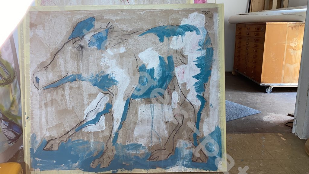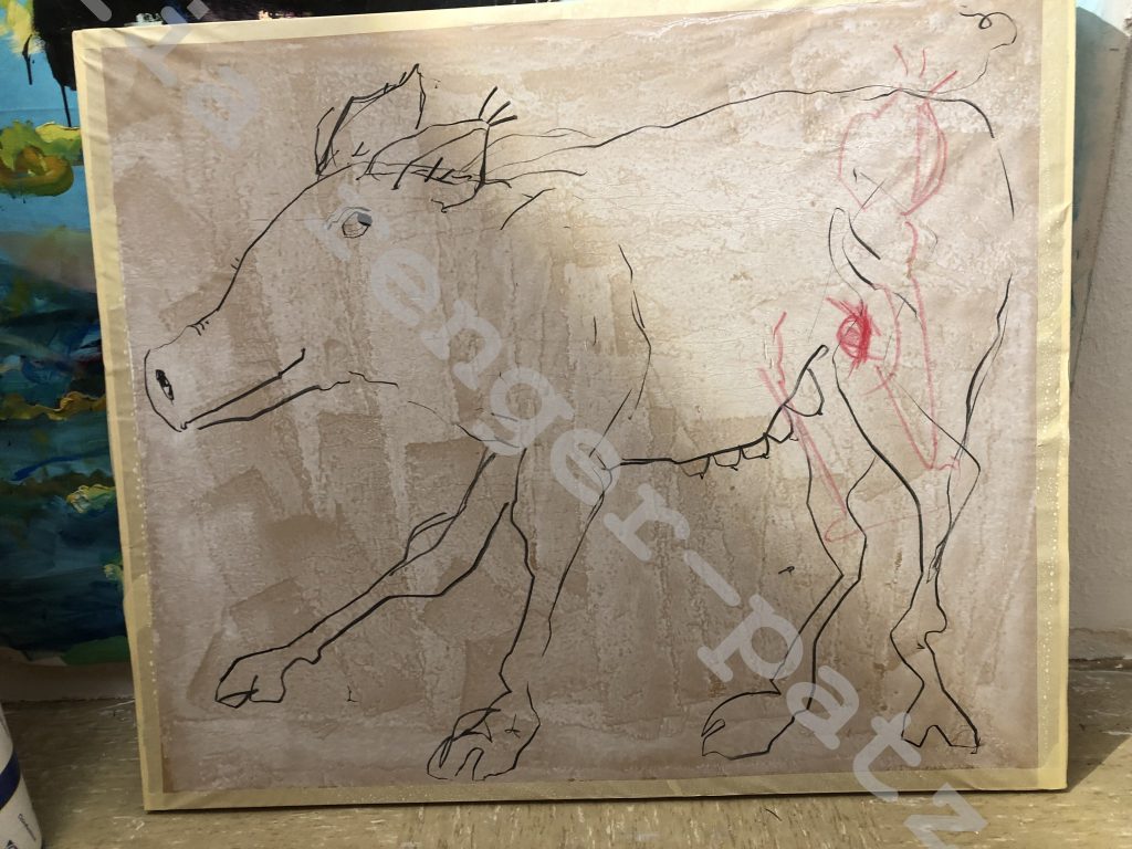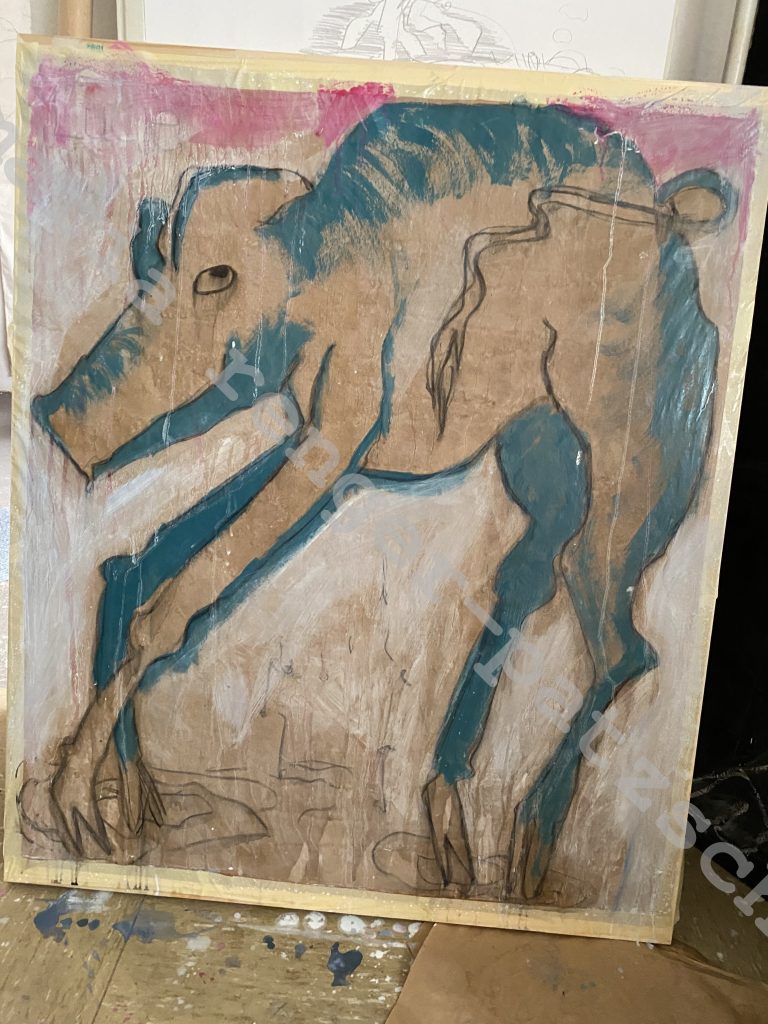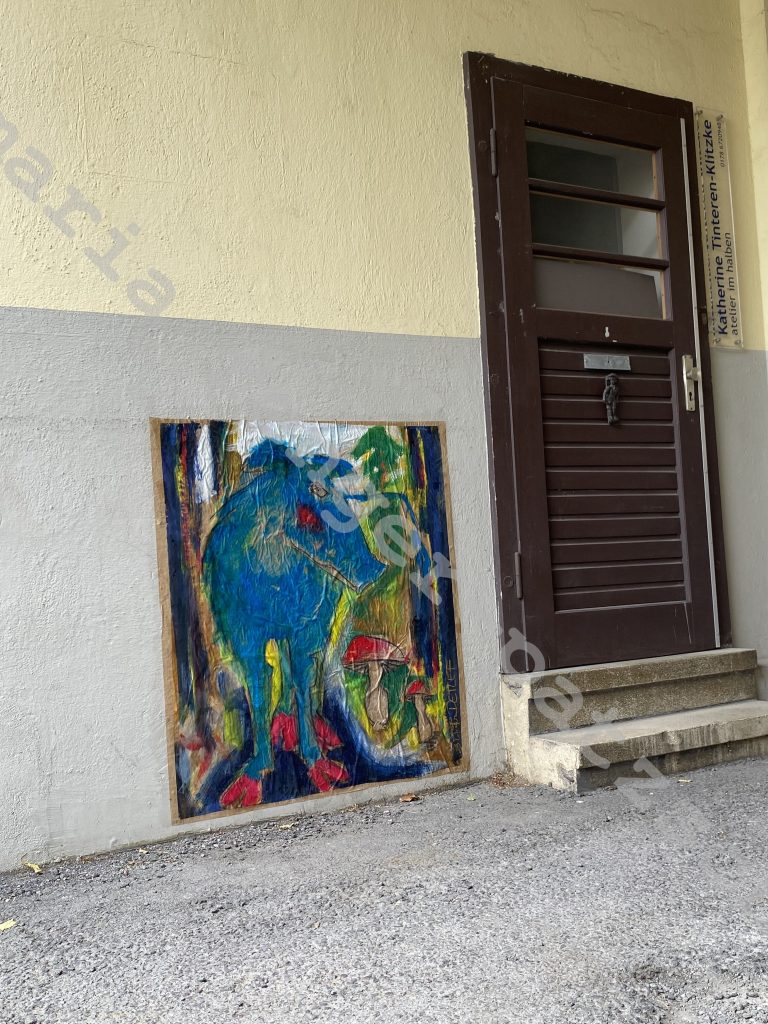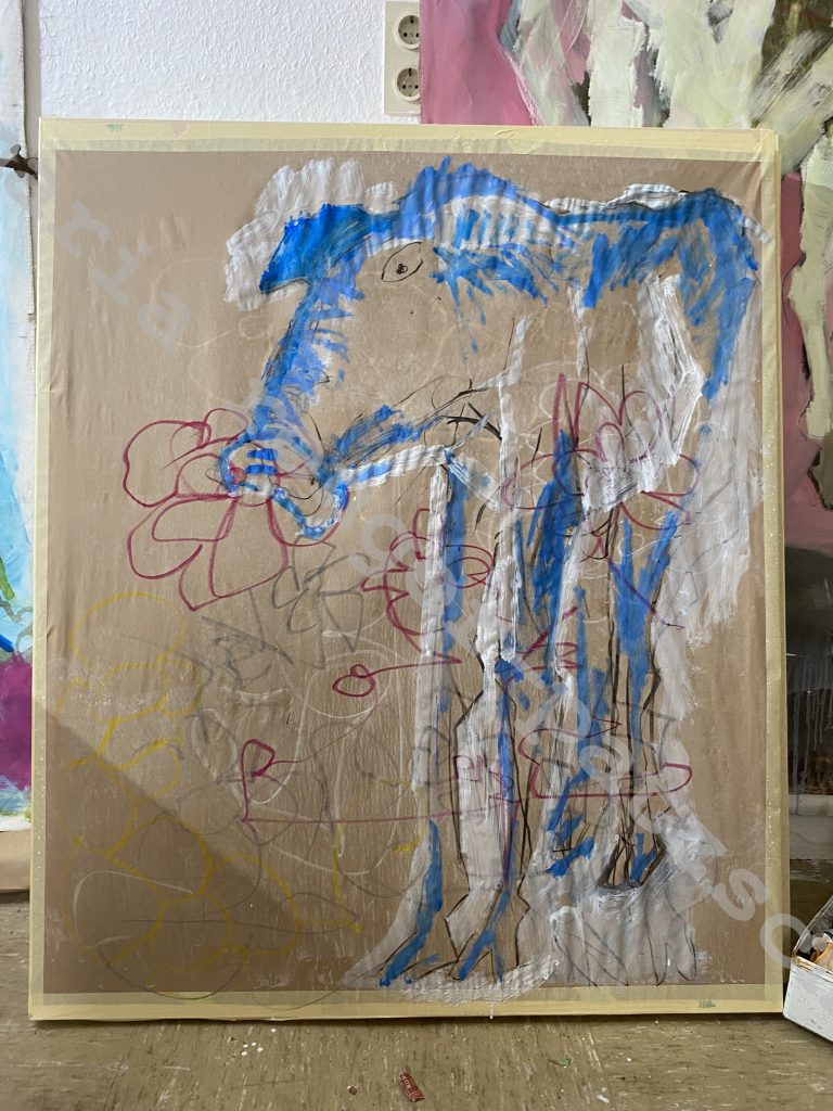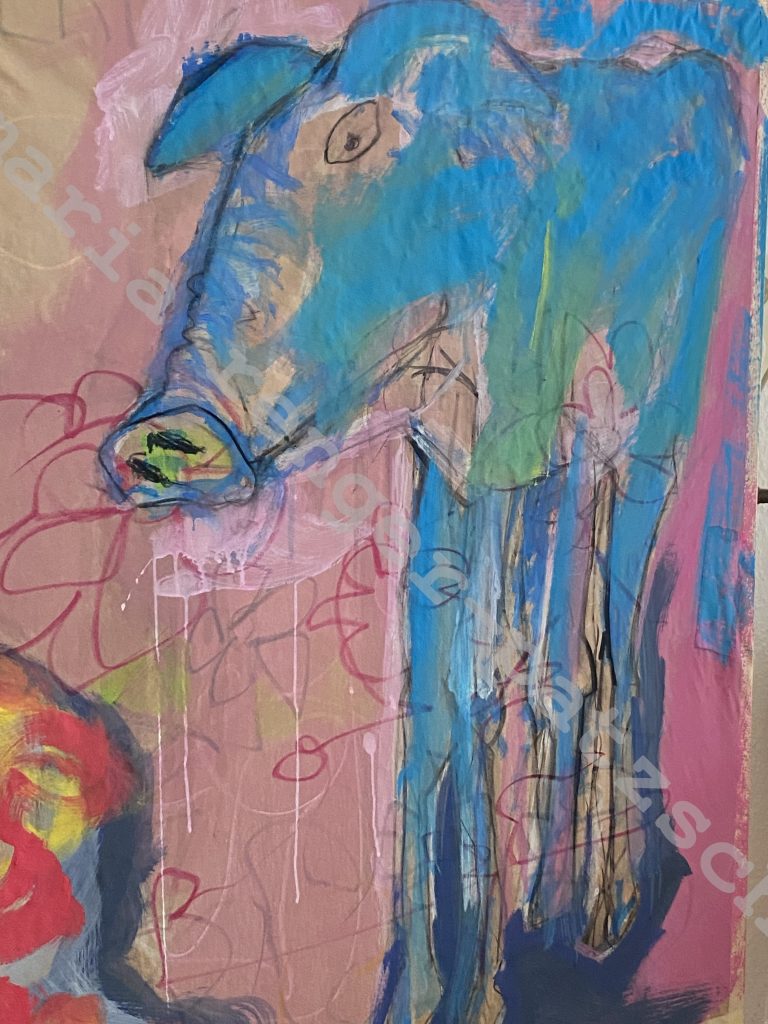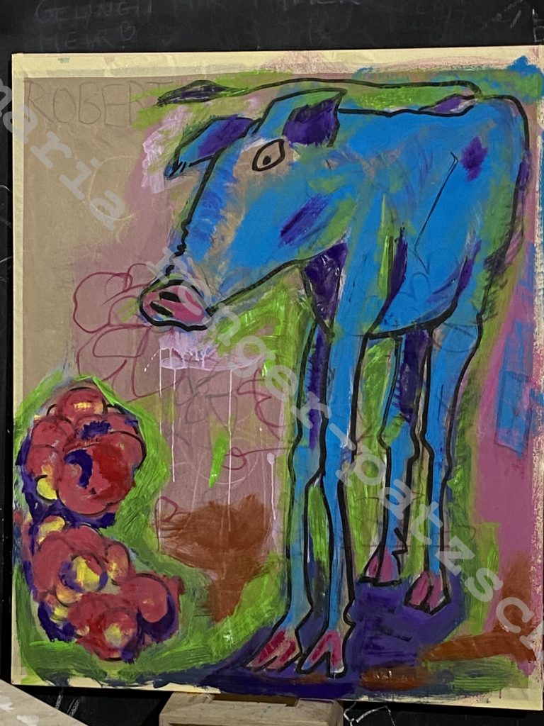 Then came the glued version on wrapping paper, created to bring the Blue Pigs onto some house walls - for those homeowners who wished for that. And the donkey returned to the canvas, checking whether everything was unfolding as it should. A fellow artist joined in, and together we created paintings. It was a wonderful experience.