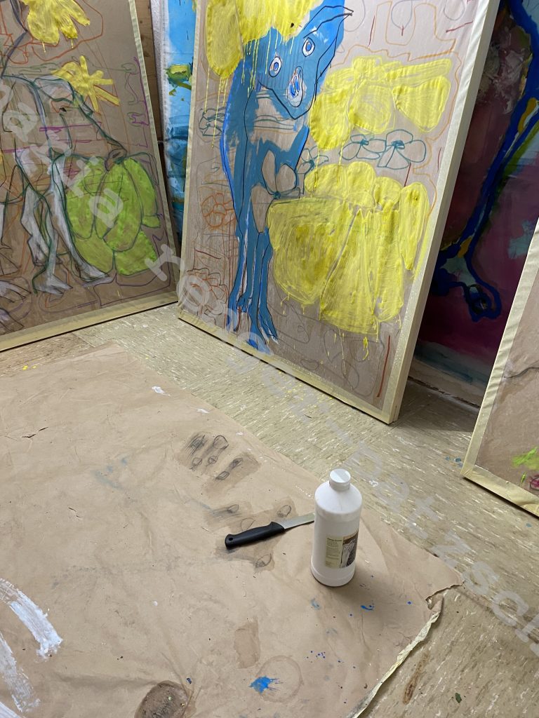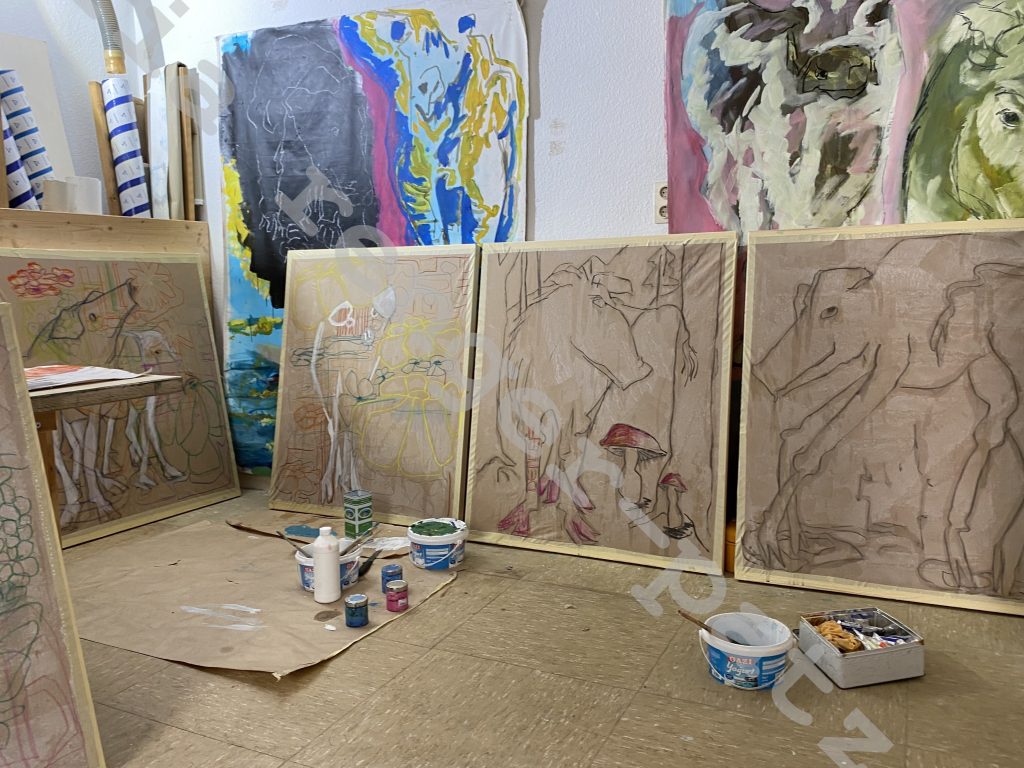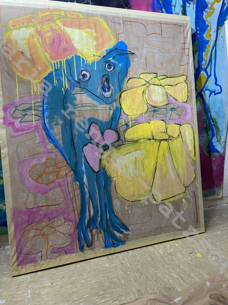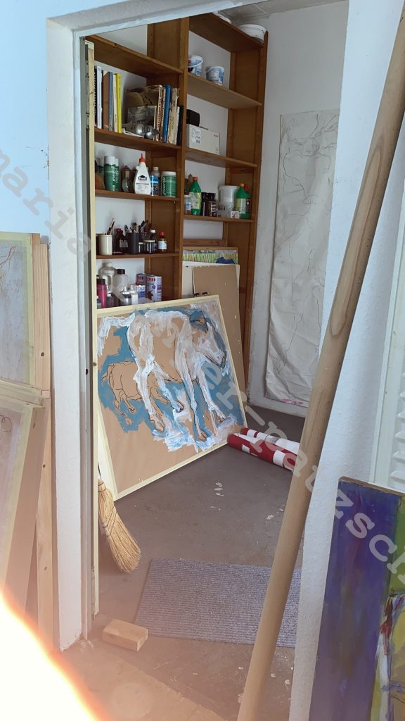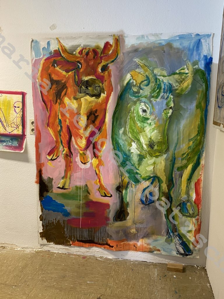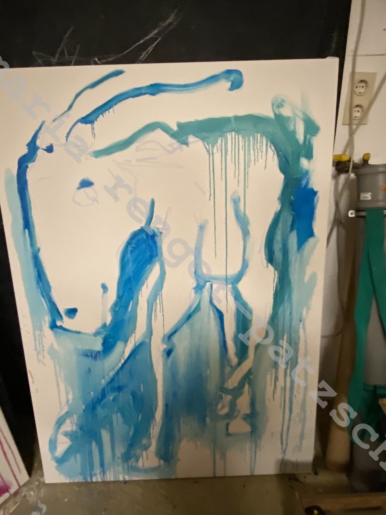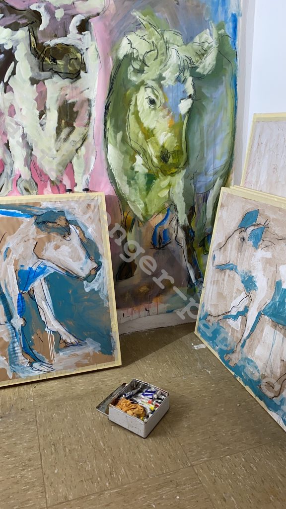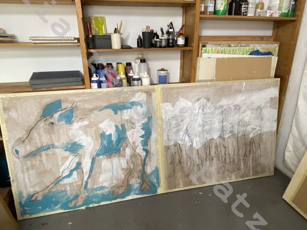 Then came the glued version on wrapping paper, created to bring the Blue Pigs onto some house walls - for those homeowners who wished for that. And the donkey returned to the canvas, checking whether everything was unfolding as it should. A fellow artist joined in, and together we created paintings. It was a wonderful experience.