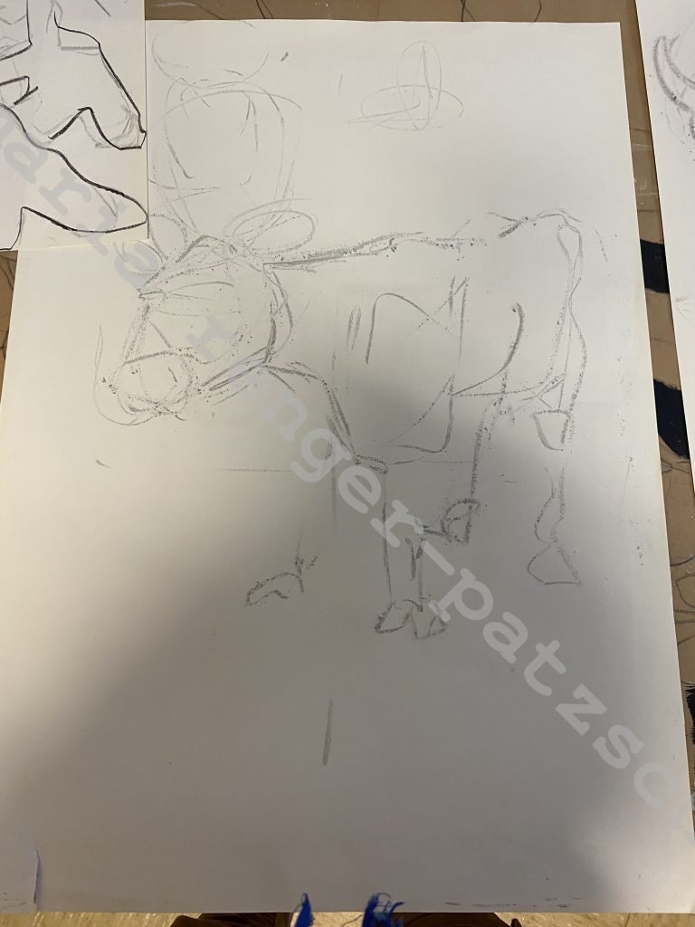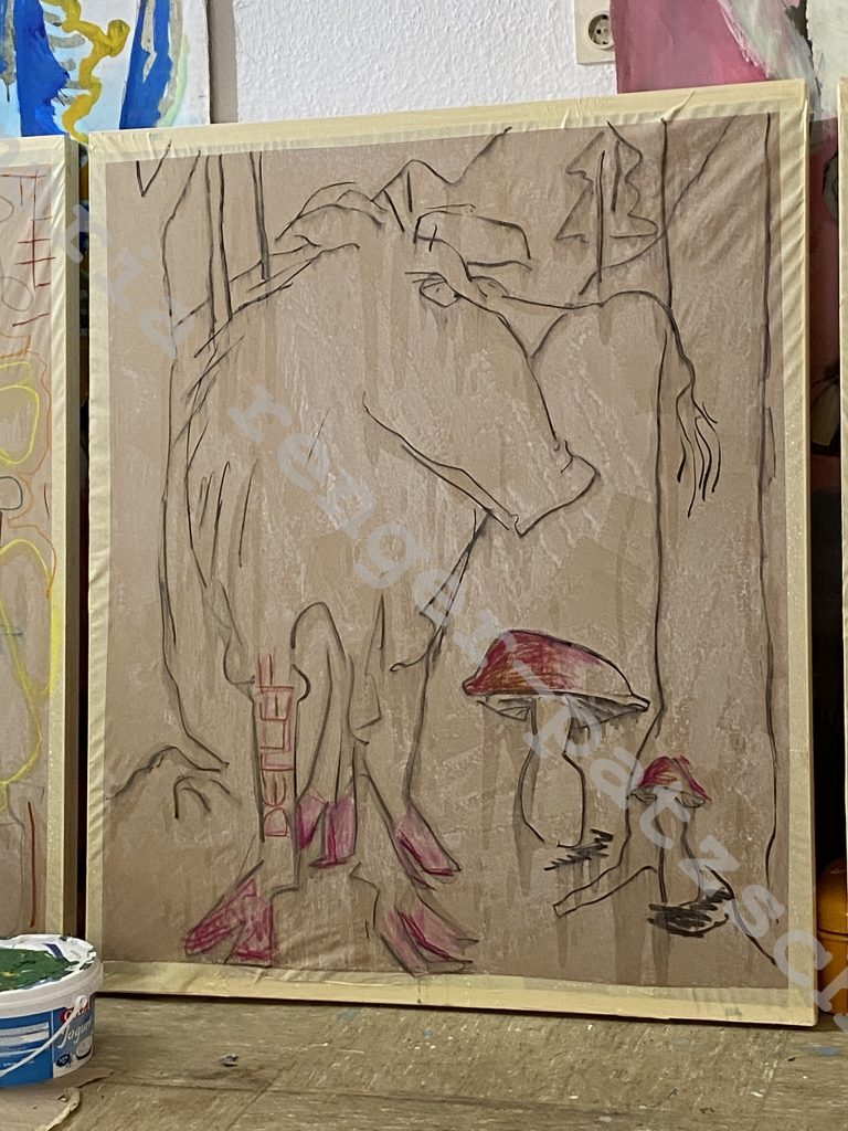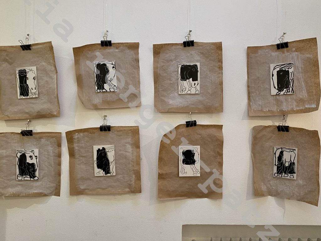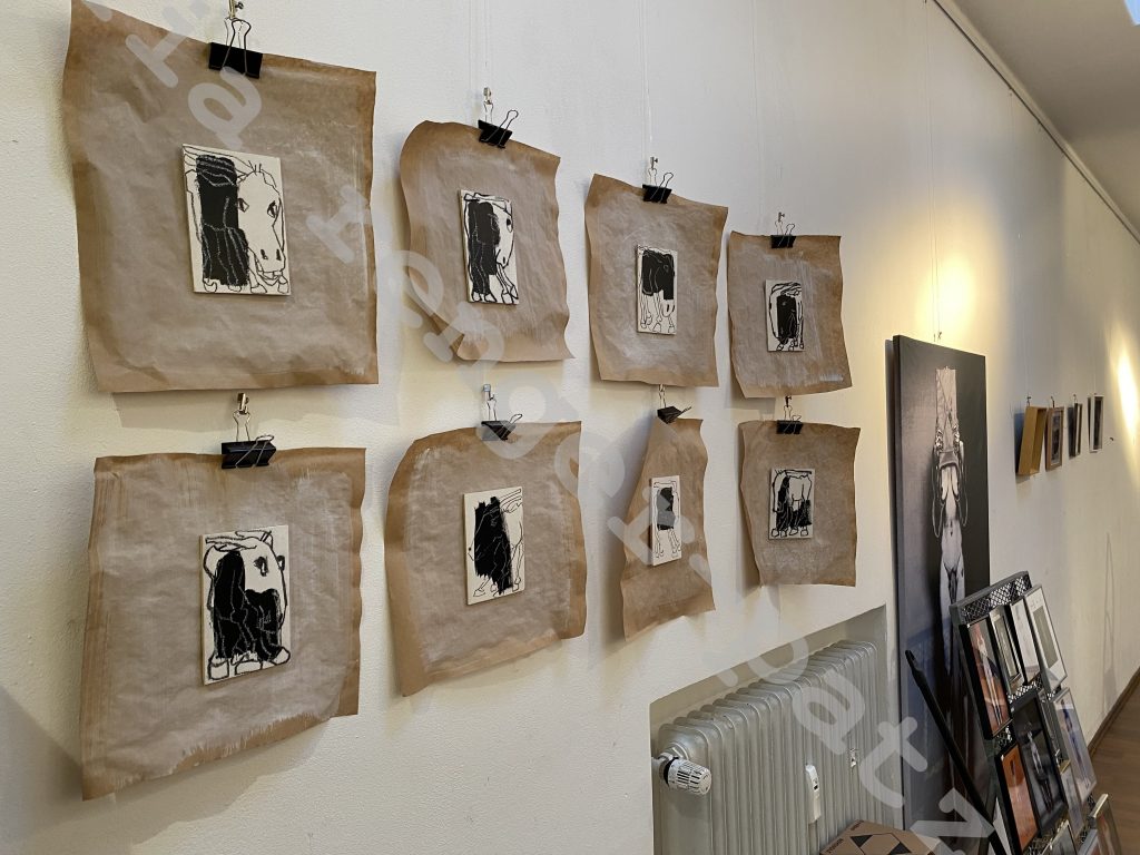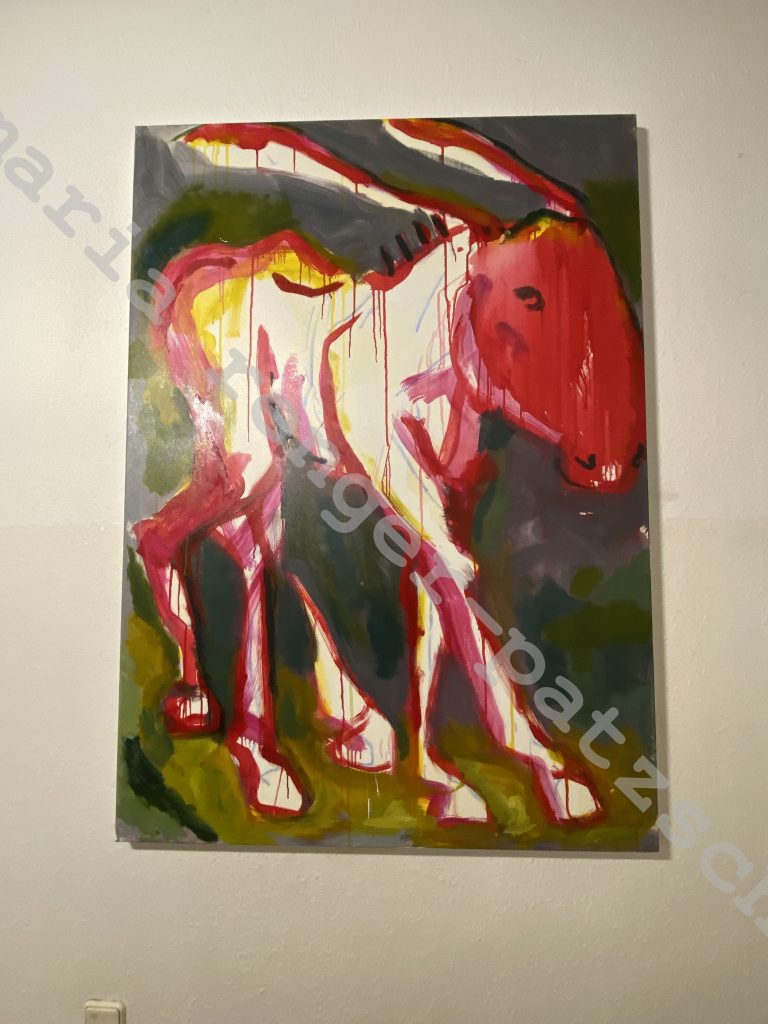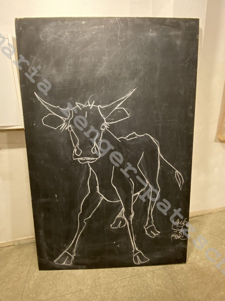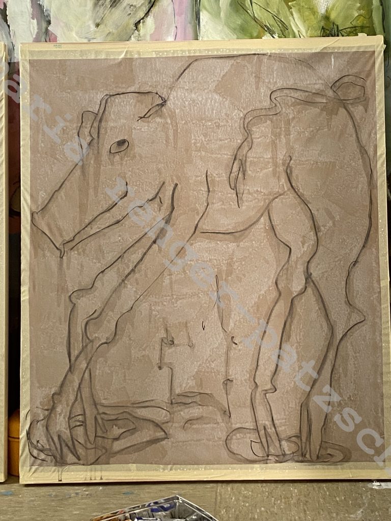 Then came the glued version on wrapping paper, created to bring the Blue Pigs onto some house walls - for those homeowners who wished for that. And the donkey returned to the canvas, checking whether everything was unfolding as it should. A fellow artist joined in, and together we created paintings. It was a wonderful experience.