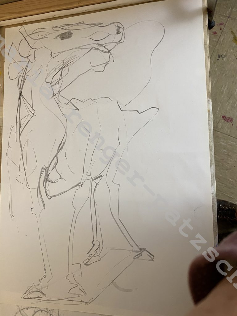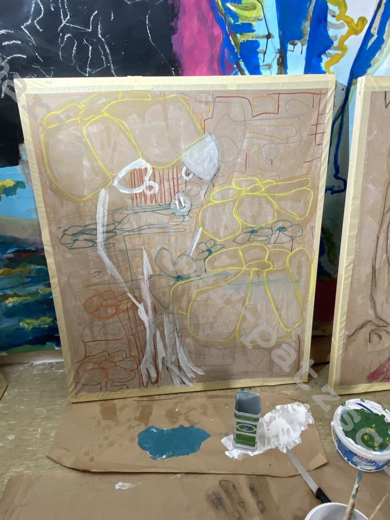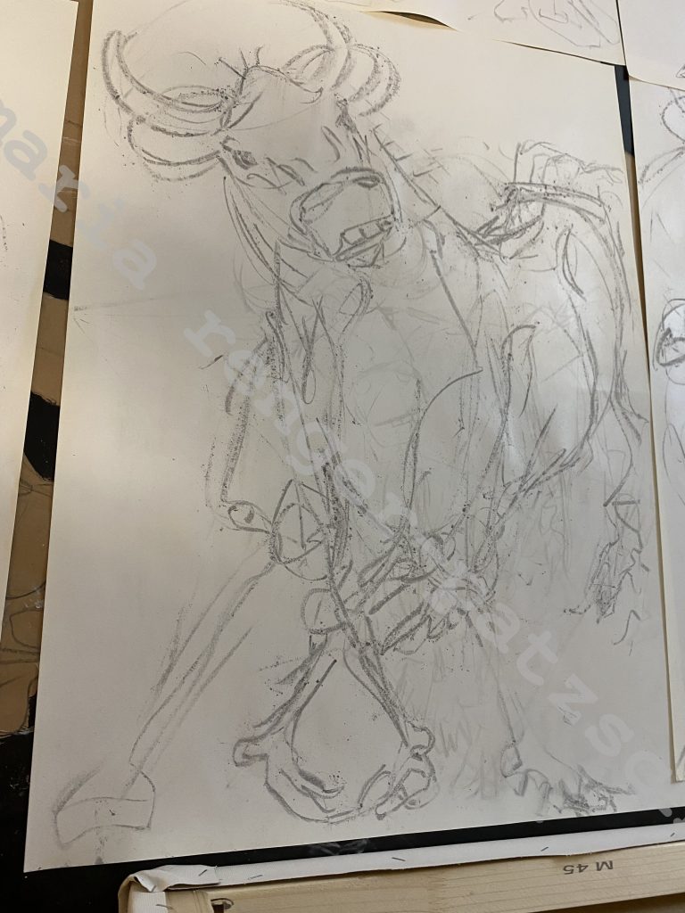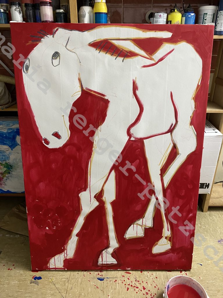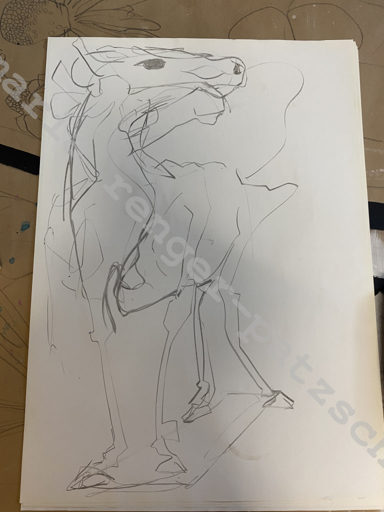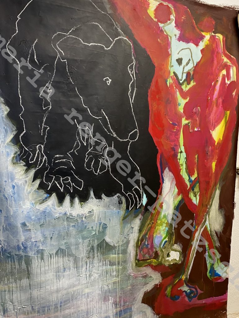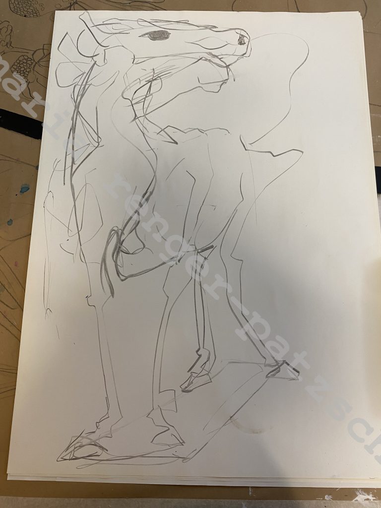 Then came the glued version on wrapping paper, created to bring the Blue Pigs onto some house walls - for those homeowners who wished for that. And the donkey returned to the canvas, checking whether everything was unfolding as it should. A fellow artist joined in, and together we created paintings. It was a wonderful experience.