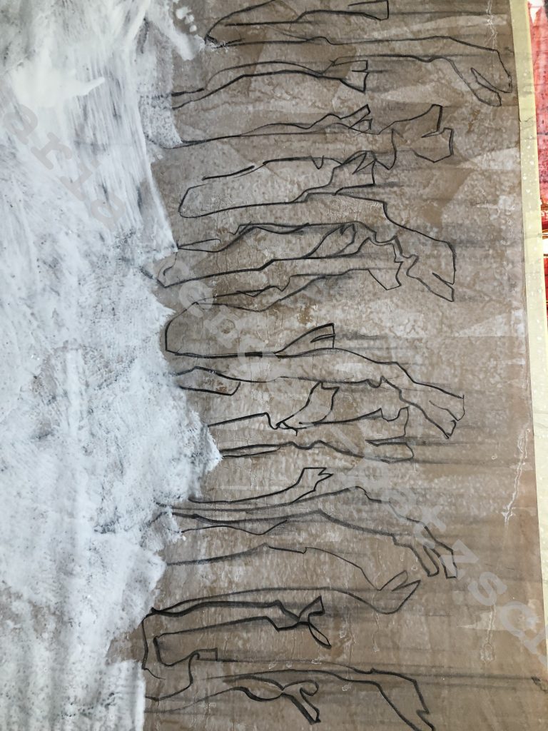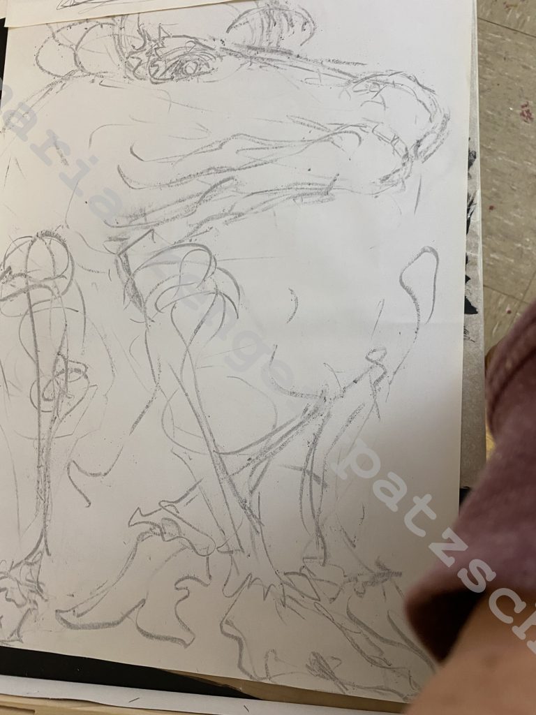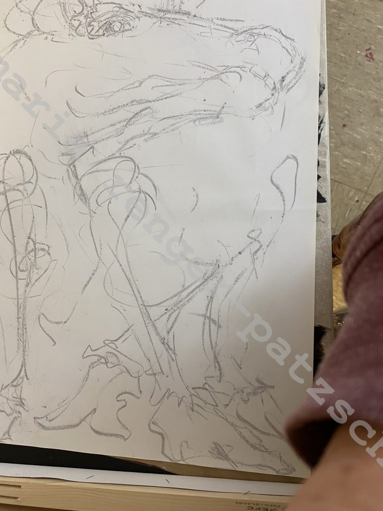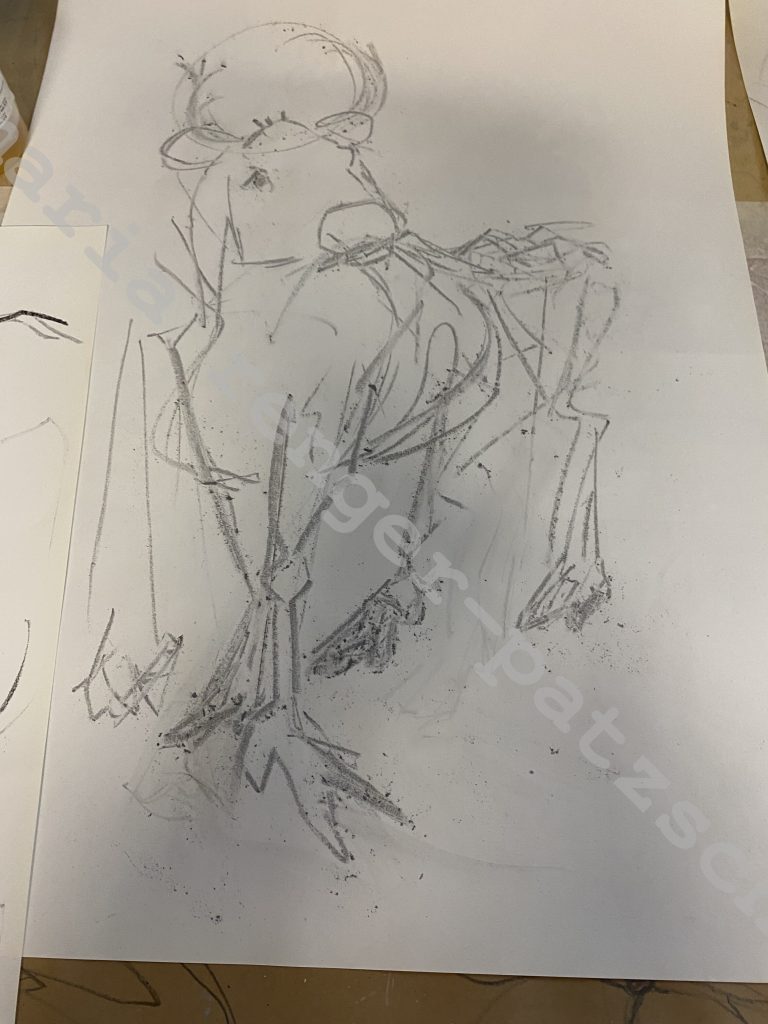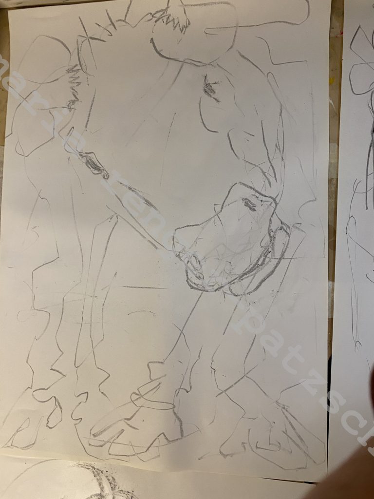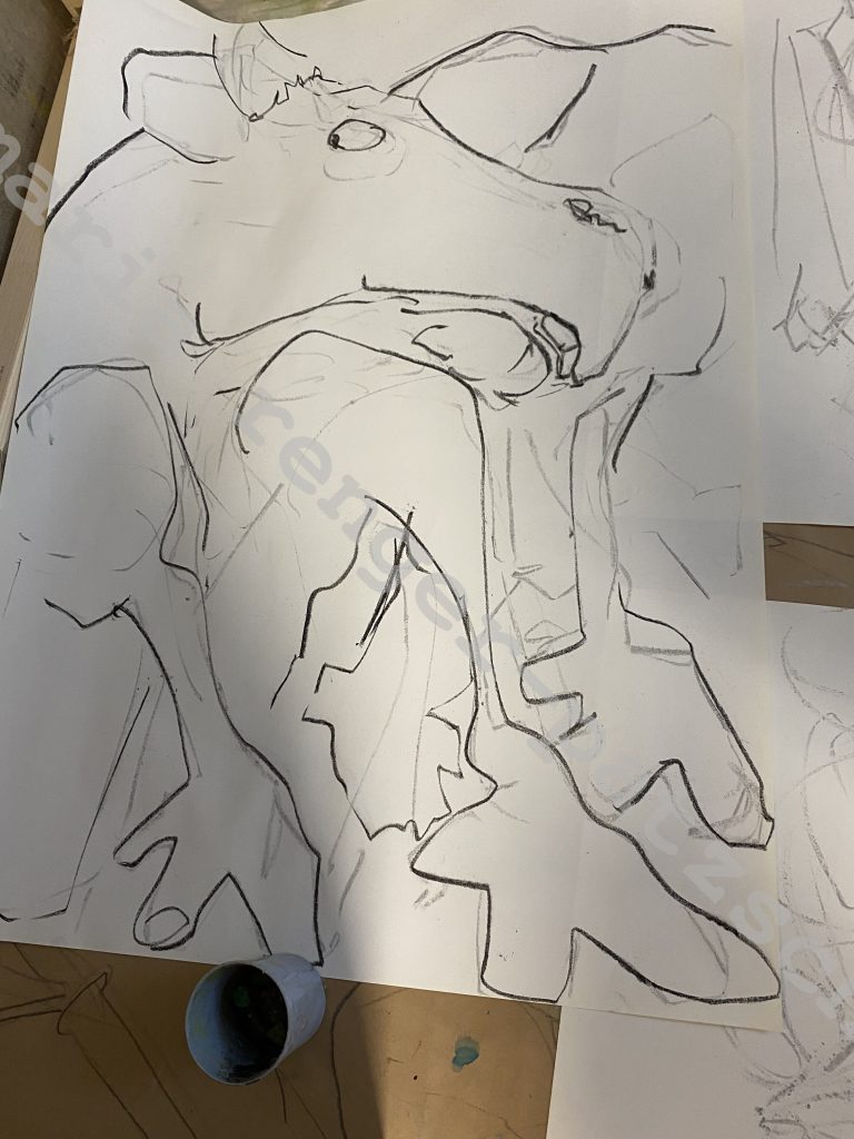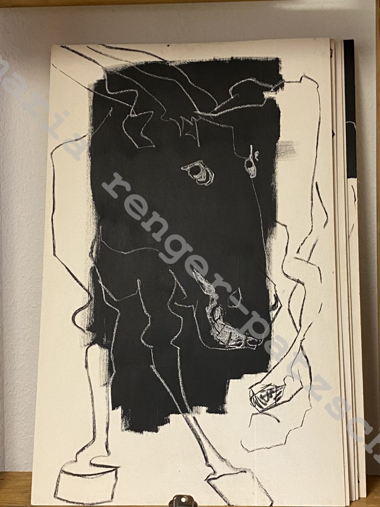 Then came the glued version on wrapping paper, created to bring the Blue Pigs onto some house walls - for those homeowners who wished for that. And the donkey returned to the canvas, checking whether everything was unfolding as it should. A fellow artist joined in, and together we created paintings. It was a wonderful experience.